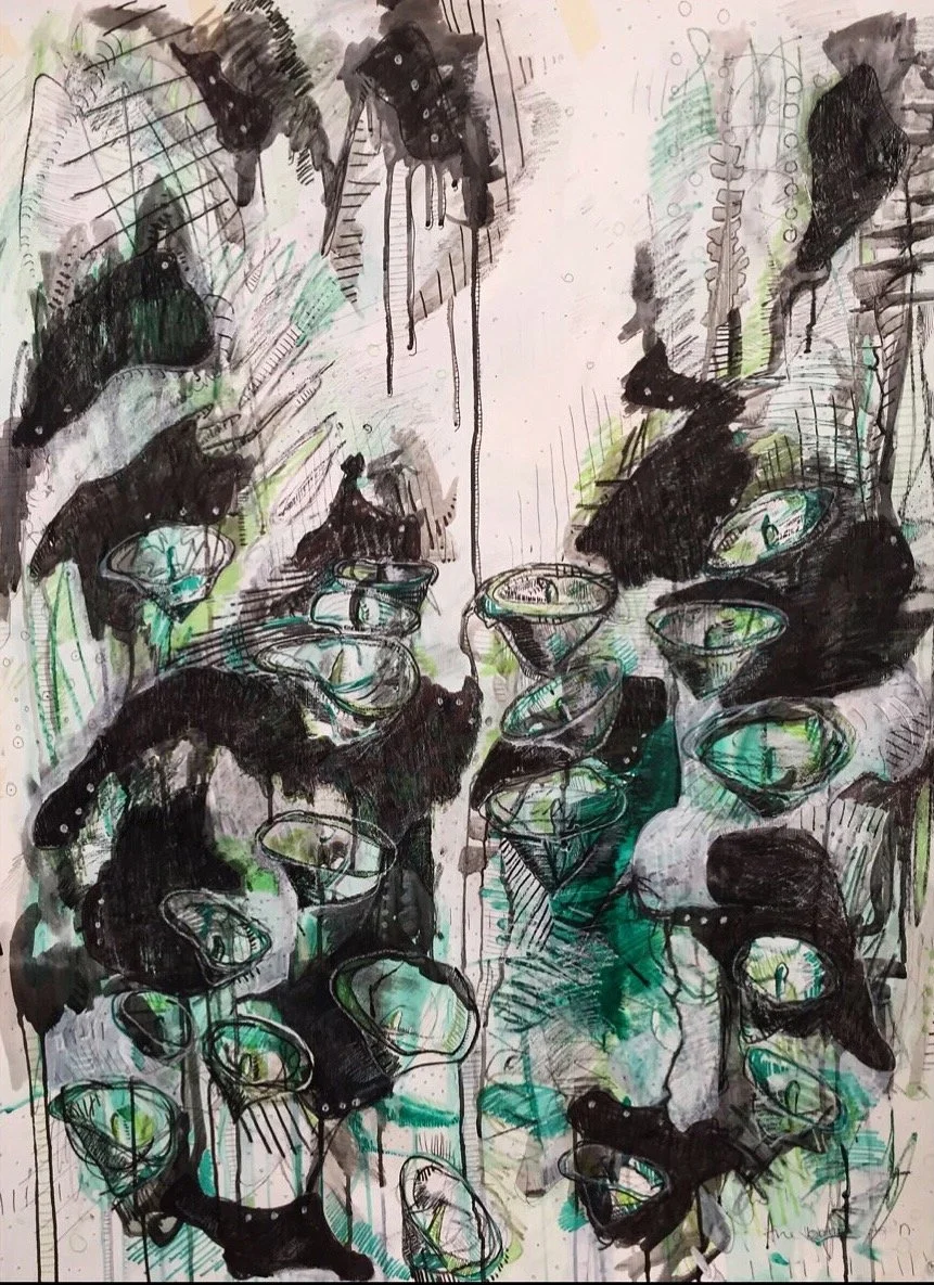 With the year anniversary approaching, the grief of reliving this traumatic loss moved me from the space in between directly to the bottom. My current work is about what grows from the bottom. This grouping still includes “Of the Sea Floor” series, continuing with familiar imagery of coral and seaweed with an addition the human presence, rocks, mushrooms, dead flowers, and the night sky. There’s an insertion of hope, as when hitting rock bottom, the only direction is up. This work is not only about the physical location of the bottom, but the psychological location of the bottom.